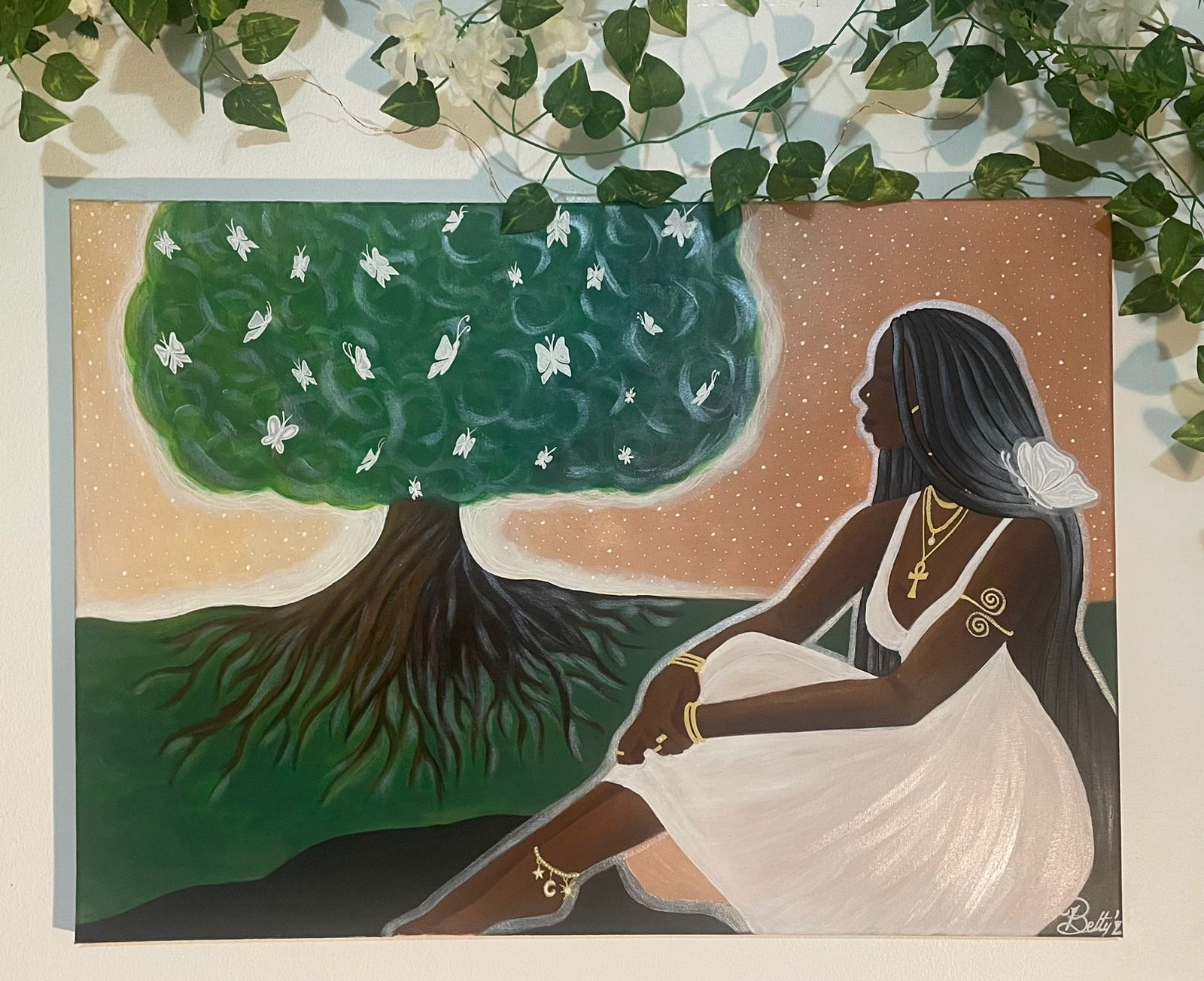 Autour d’elle, les papillons s’élèvent comme des possibilités de transformation. Ils symbolisent les chemins d’évolution, les multiples directions qu’elle aurait pu emprunter. Celui qui s’est posé sur son épaule représente la transformation qu’elle a choisie en conscience.